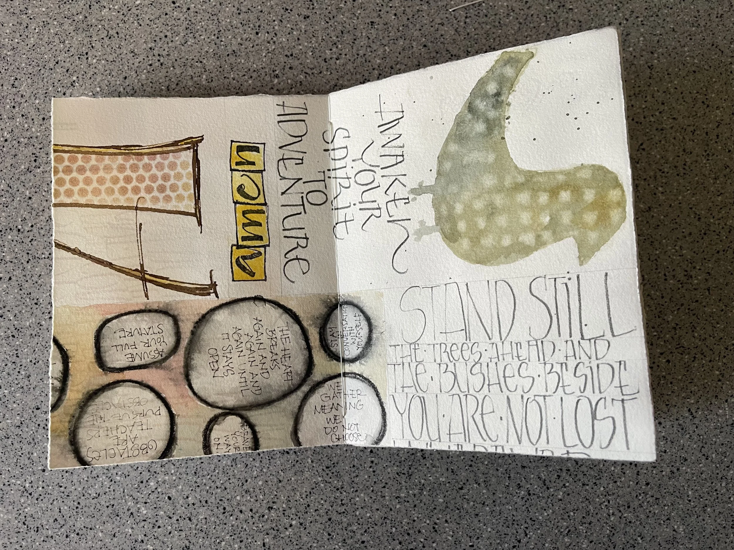 What great time we had on the Zoom platform. This was a six week workshop, every Wednesday night in the month of January and the first two Wednesdays in February. Using half sheets of Arches Text Wove, we created grids and played with many, many techniques. Stencils, rubber stamps, distressed inks, watercolor, water soluble crayons, masks, walnut ink, sumi ink, pencil lettering, nib lettering, stabilo pencil, folded pens, color swatches in a variety of shapes, gel plates, color wheels and more! We bound our signatures and created a lovely work to admire and continue to work in. This was truly a class of adventure, playful fun, and exploration into all the myriad of our many art supplies!